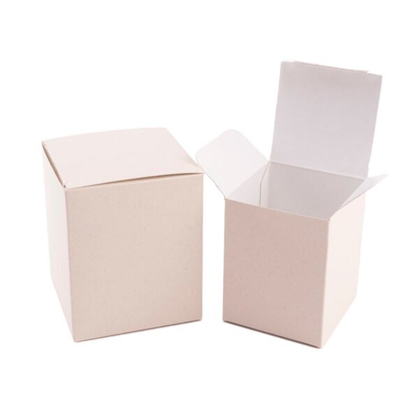 la caja cubo es una Caja rectangular pequeña, perfecta para. productos artesanales, joyería o pequeños obsequios. resistente y de fácil armado. Disponible en dos tonos neutros y elegantes: crudo (marfil claro) y kraft (marrón natural),en medidas de 8X8X10 ideales para presentaciones con estilo ecológico.