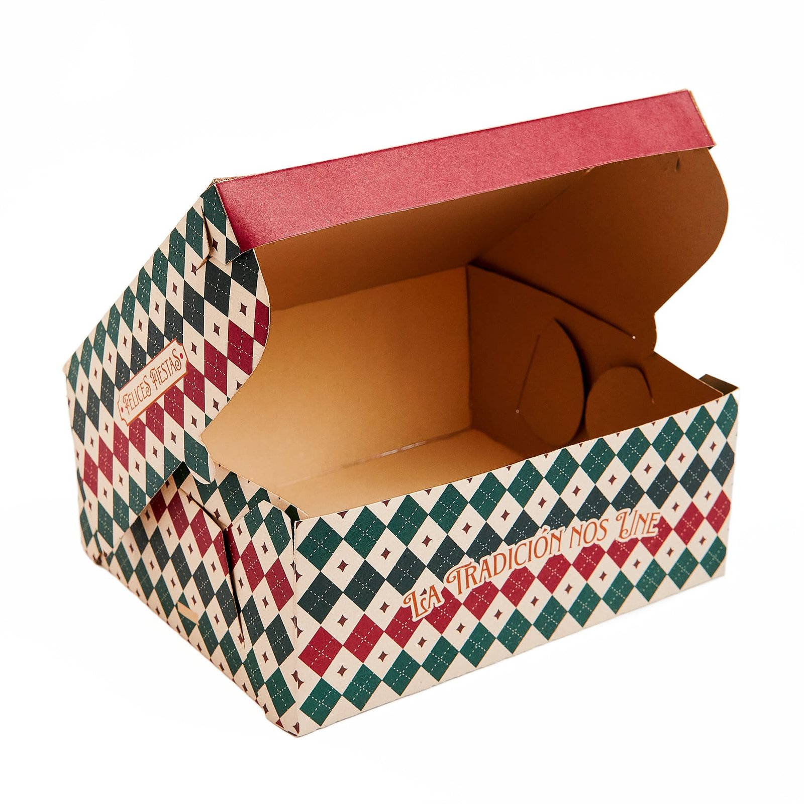 Caja de cartón resistente con estampado navideño ideal para empacar kits de productos, prendas, galletas y demás. Este empaque compacto proporciona una solución eficiente para exhibir y entregar tus productos de manera segura.