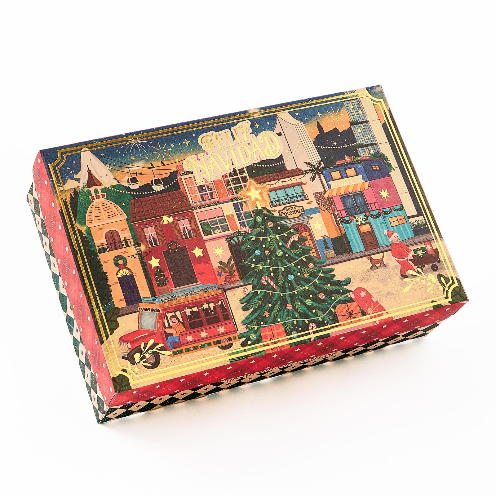 Fabricada con cartón resistente, garantiza la integridad de tus productos, con estampado navideño.
