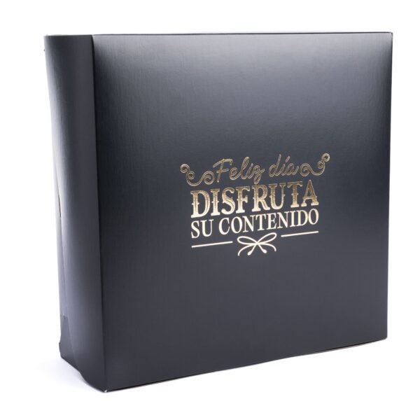 Caja de cartón Negro con Estampado metalizado dorado (feliz día) 25x25x10