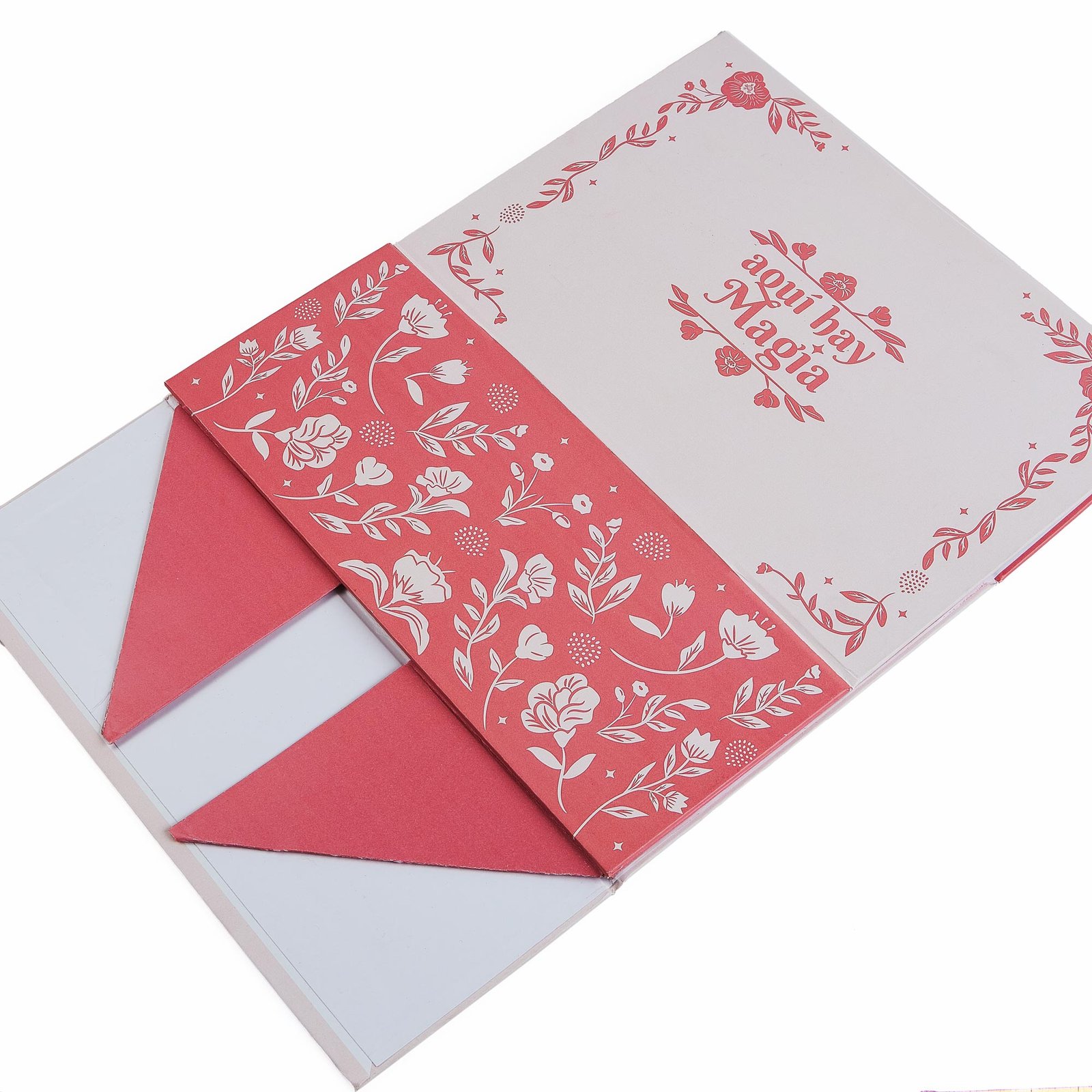 Hecha en cartón industrial plegable, resistente y funcional, diseñada para brindar practicidad sin perder estilo. En el mensaje dice «Aquí hay magia» que inspira y hace cada detalle especial, es ideal para empacar regalos, armar desayunos sorpresa o presentar productos de forma creativa y elegante. Fácil de armar, segura y perfecta para sorprender en cualquier ocasión.